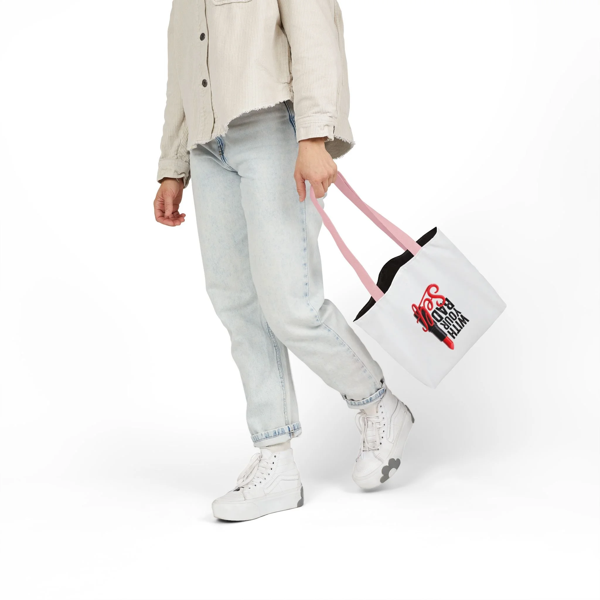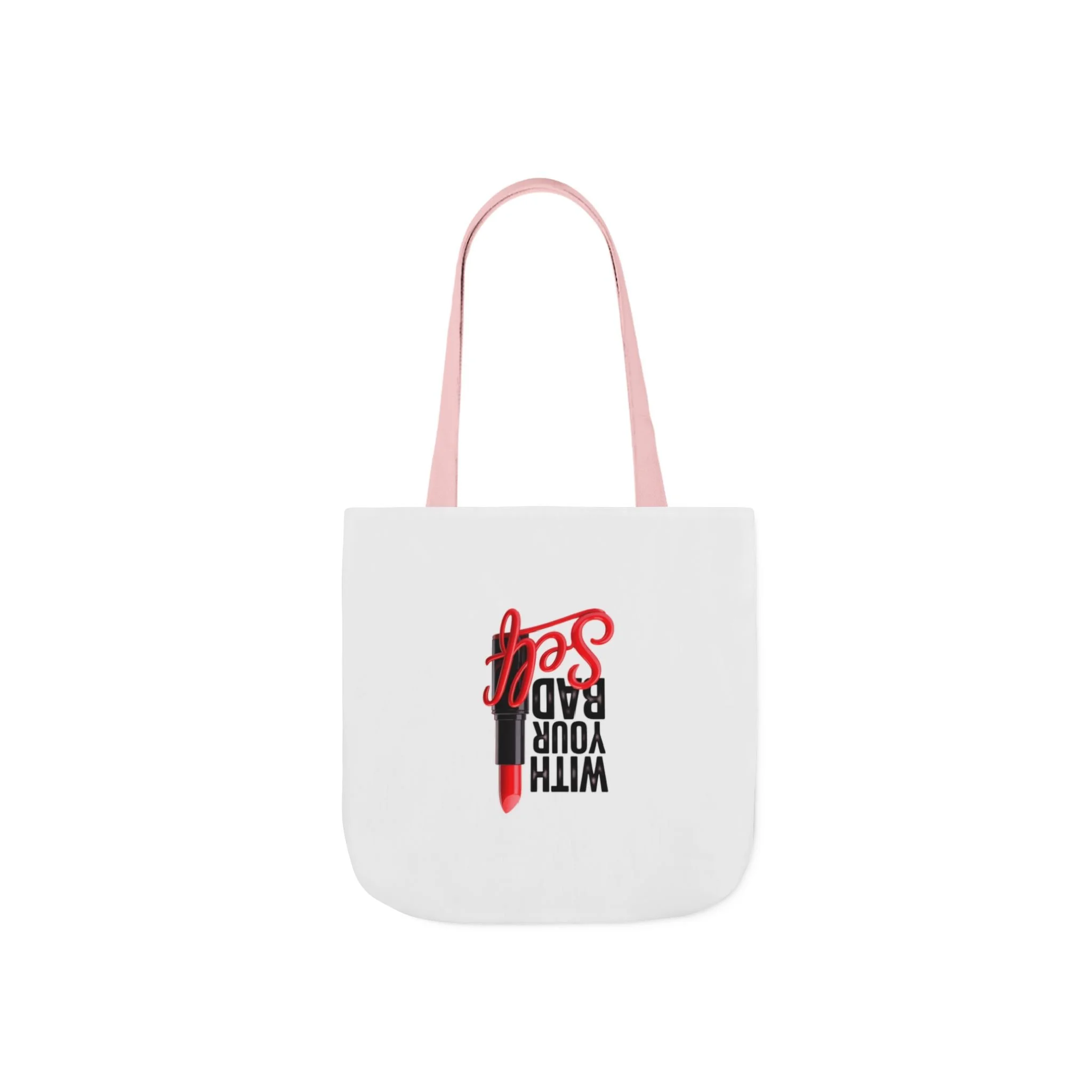 Light, bold, and just a little sassy — this printed canvas tote brings attitude to everyday carry. The white canvas background makes the cheeky “With Your Bad Self” lipstick graphic pop, while boxed corners and roomy interior give you space for a laptop, planner, groceries, or that extra makeup pouch. The long, colored straps sit comfortably on your shoulder and add a subtle contrast to the clean, all-over print. It’s the kind of bag you reach for when you want to add a wink to a coffee run, market day, or a casual meet-up with friends.